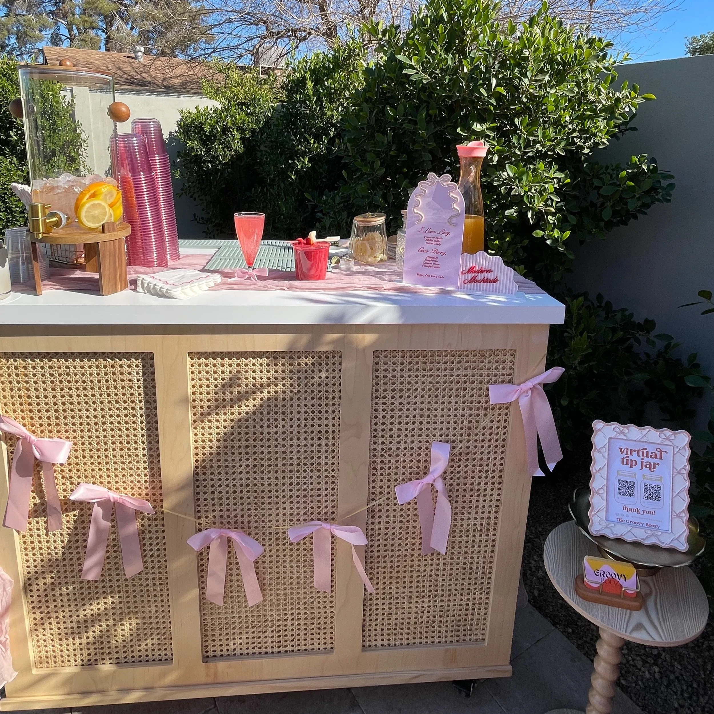 The Groovy Boozy’s custom portable bar-a stylish and versatile centerpiece for any event! Our bar features an interchangeable front board, allowing you to customize the look to match your theme. Rattan not your vibe? No problem, we’ll remove it for a sleek all wooden background. Whether you’re hosting a wedding, corporate event, or private party, this sleek and functional setup ensures a seamless bartending experience. Here’s some pictures from past events and photoshoots so you can get a feel for what we’re all about!