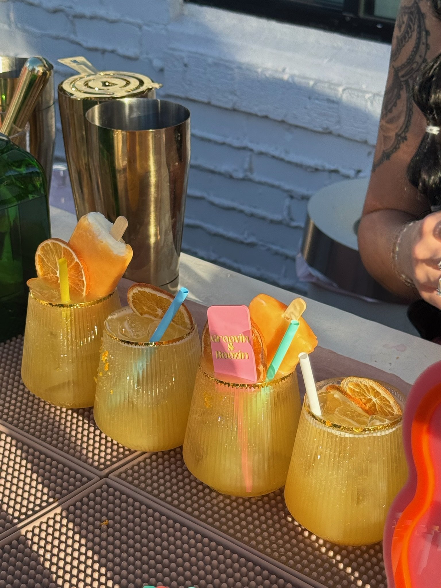 The Groovy Boozy’s custom portable bar-a stylish and versatile centerpiece for any event! Our bar features an interchangeable front board, allowing you to customize the look to match your theme. Rattan not your vibe? No problem, we’ll remove it for a sleek all wooden background. Whether you’re hosting a wedding, corporate event, or private party, this sleek and functional setup ensures a seamless bartending experience. Here’s some pictures from past events and photoshoots so you can get a feel for what we’re all about!